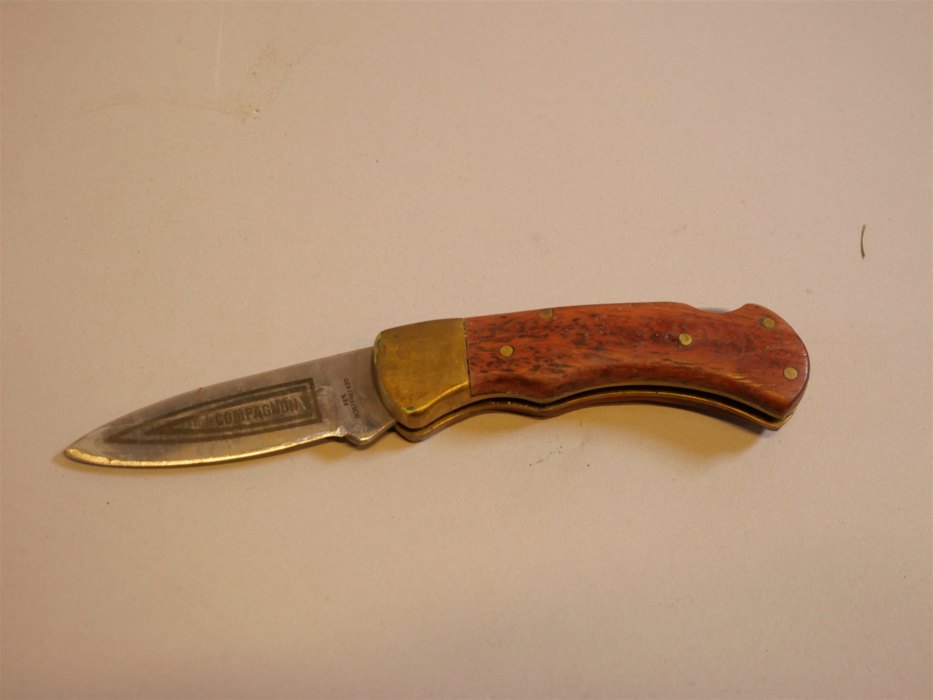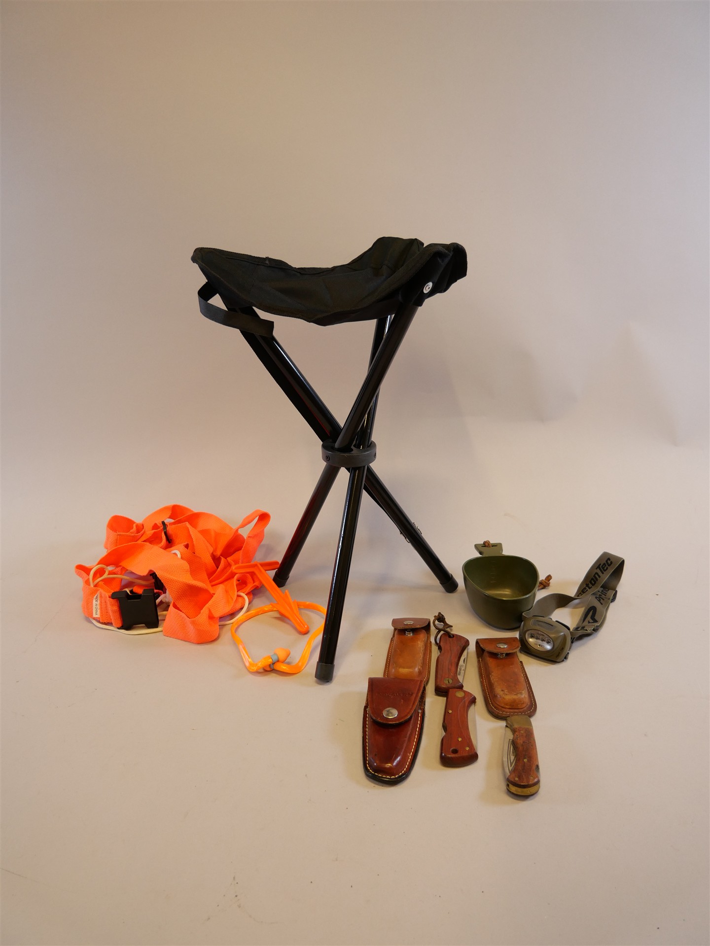 394. FÄLLKNIVAR 3 st med skinnfodral. Pannlampa, kåsa mm.