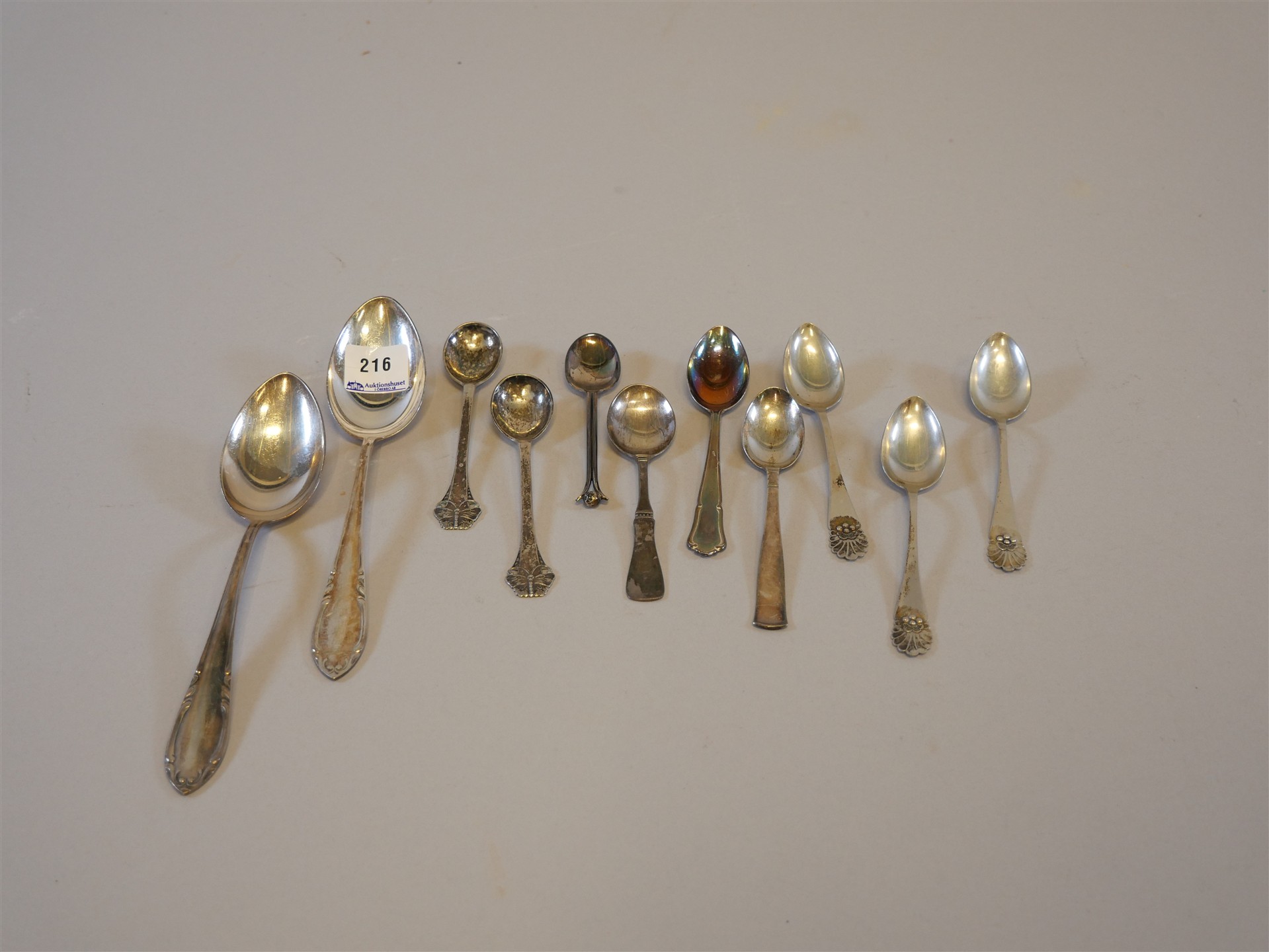 216. MATSKEDAR 2 st och kaffeskedar 9 st olika modeller. Kontr.S. Vikt 215 gram.