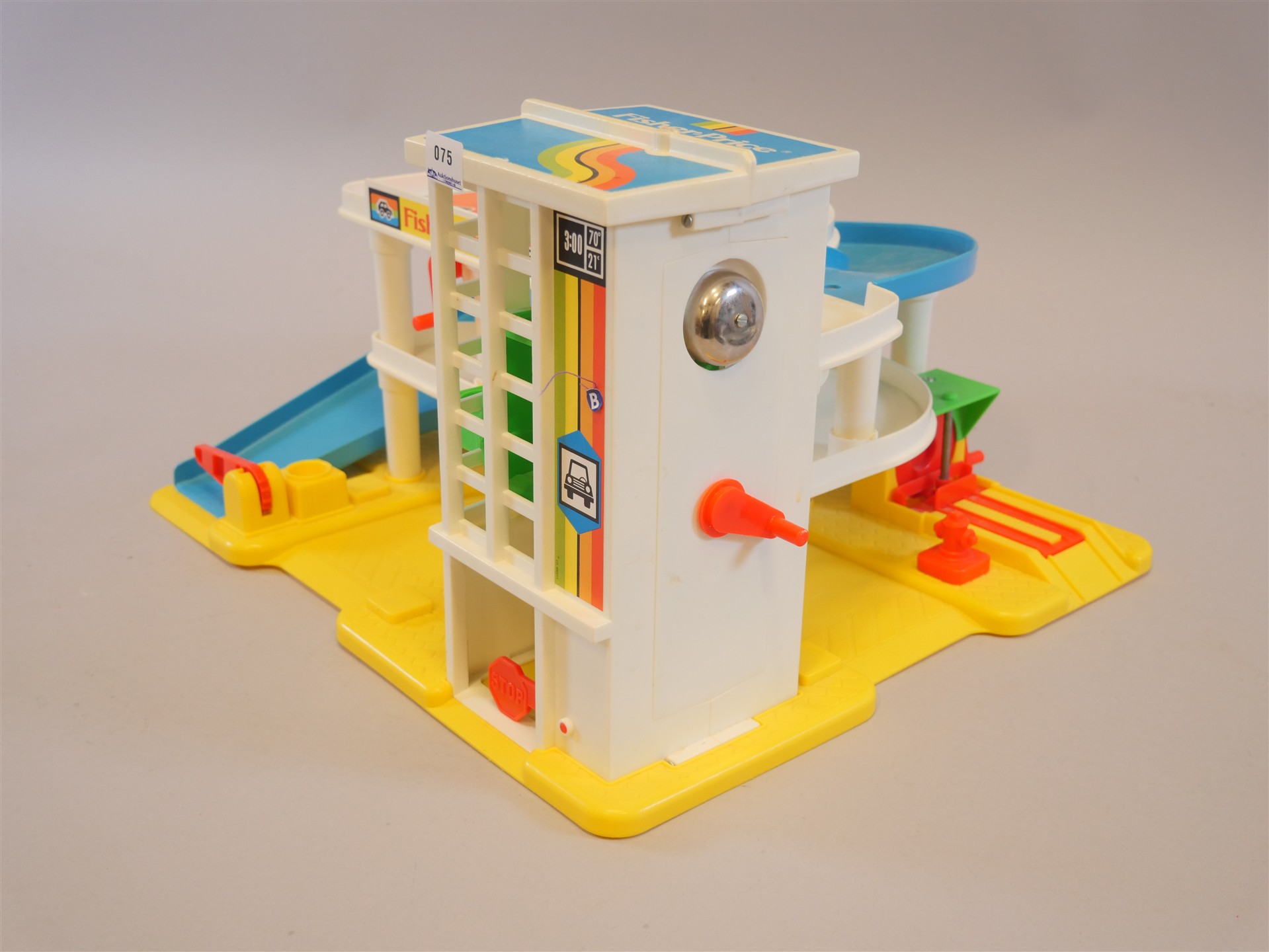 075. FISHER PRICE Familygaragen. H 26,5, cm. L 45 cm. B 39,5 cm.