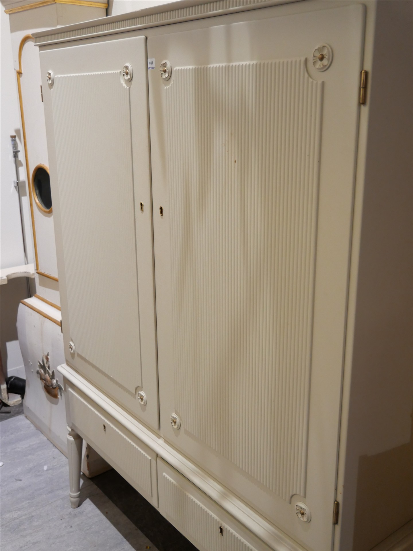 081. LINNESKÅP. Gust.stil. Vänster framben skadat. H 148 cm. B 141,5 cm. DJ 37 cm.