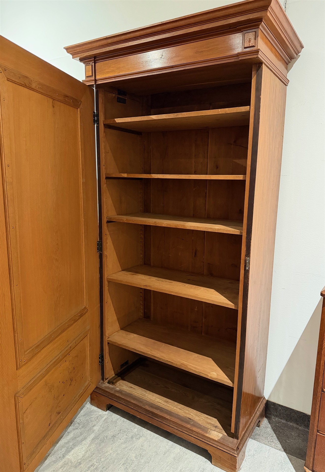 144. SKÅP nyrenässans. med hyllplan med bl a valnötsfanér, torrspricka i dörren och någon liten valnötsfanérskada. H 215 cm. B 110 cm. Dj 48 cm.