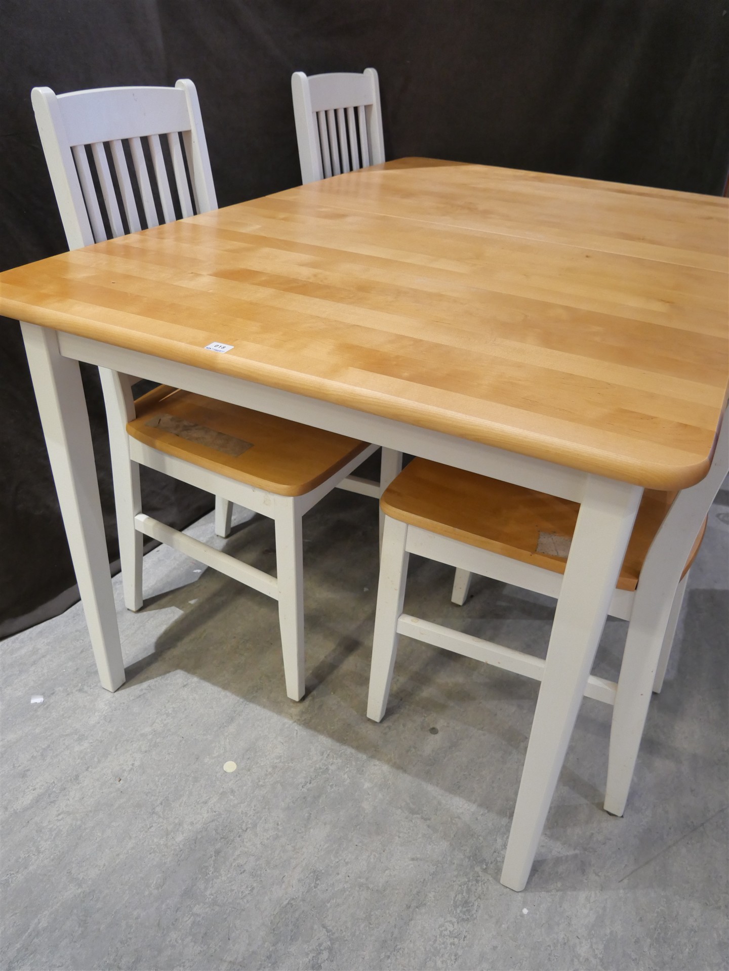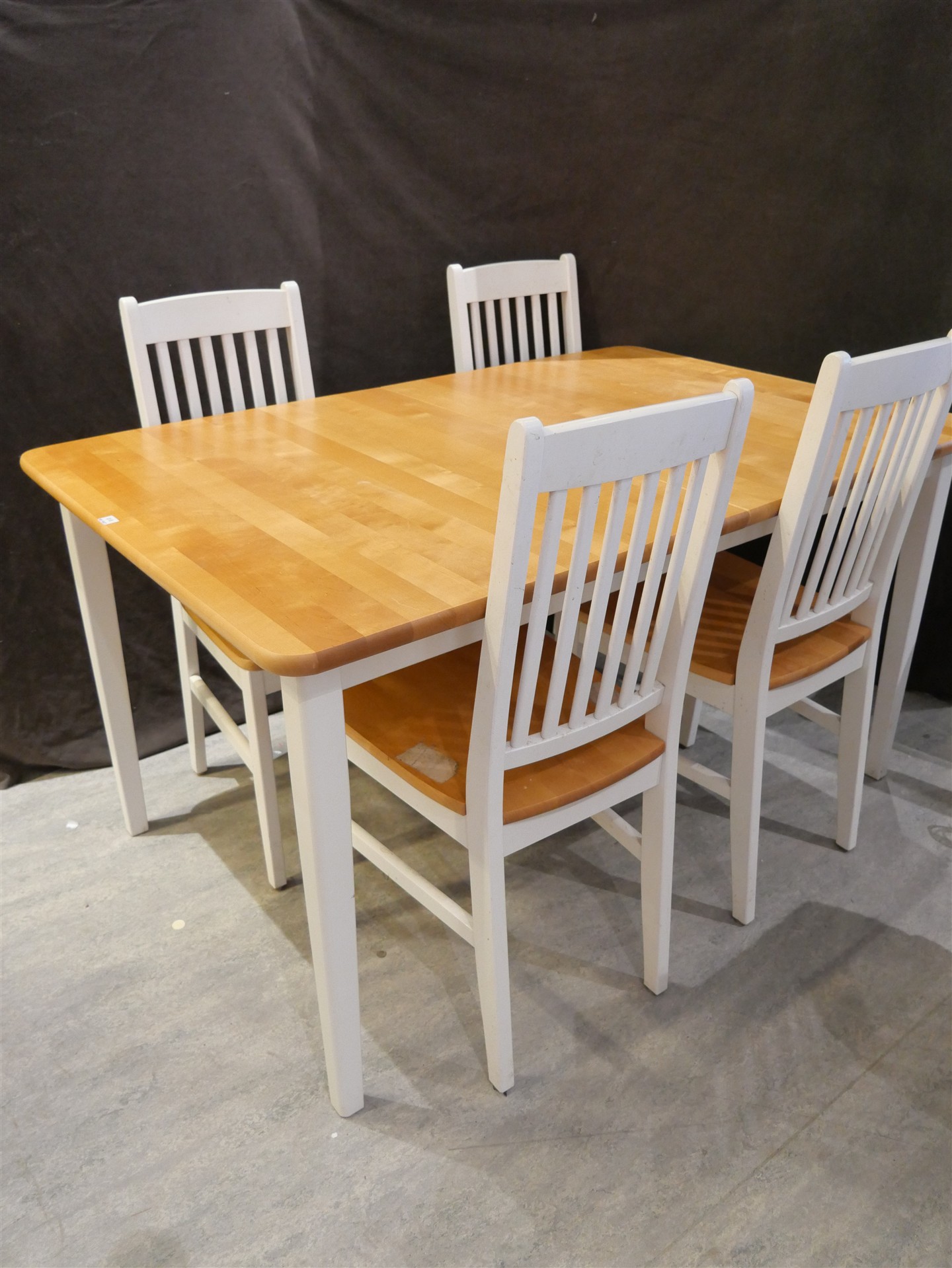 018. MATBORD m en iläggsskiva 45 cm. 4 stolar med dubbelhäftad tejp på3 sitsarna.H 74,5 cm. L 138,5 cm. B 89 cm.