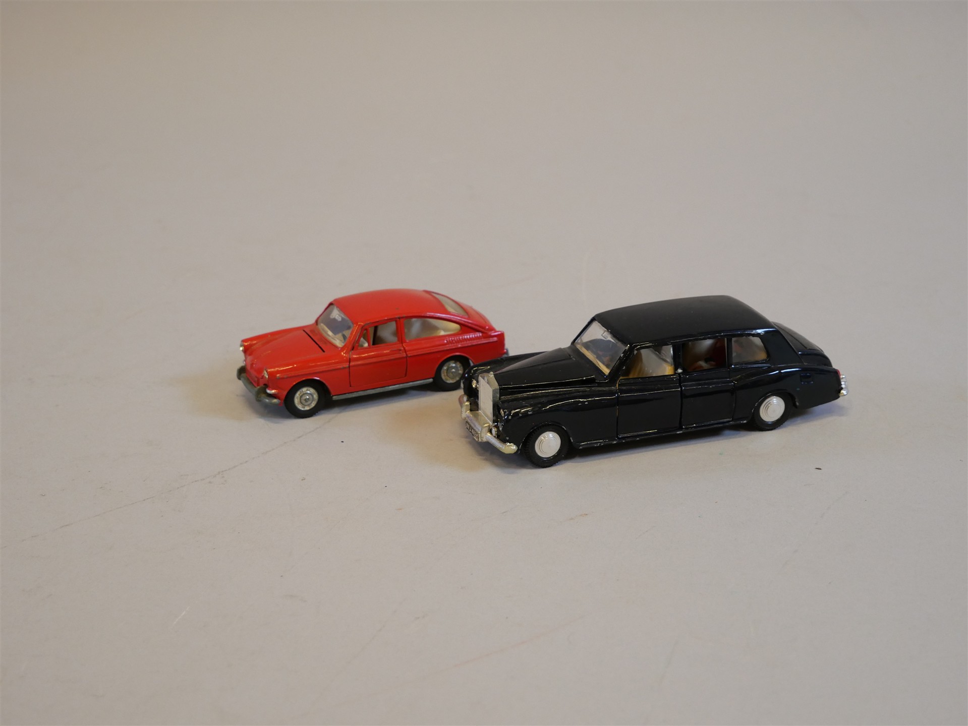 388. DINKY TOYS. Rolls Royce Phantom V Modellbil, svart. L 14 cm. DINKY TOYS VW 1600 TL. L 10 cm.