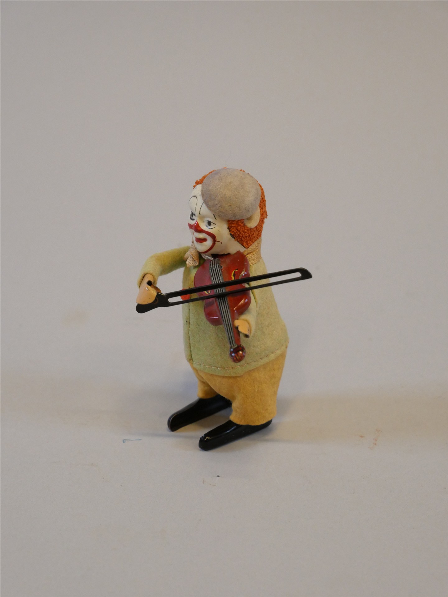108. SCHUCO. Fiolspelande clown, urverk, made in Germany. Plåt & filt. H 11 cm. Fungerar.
