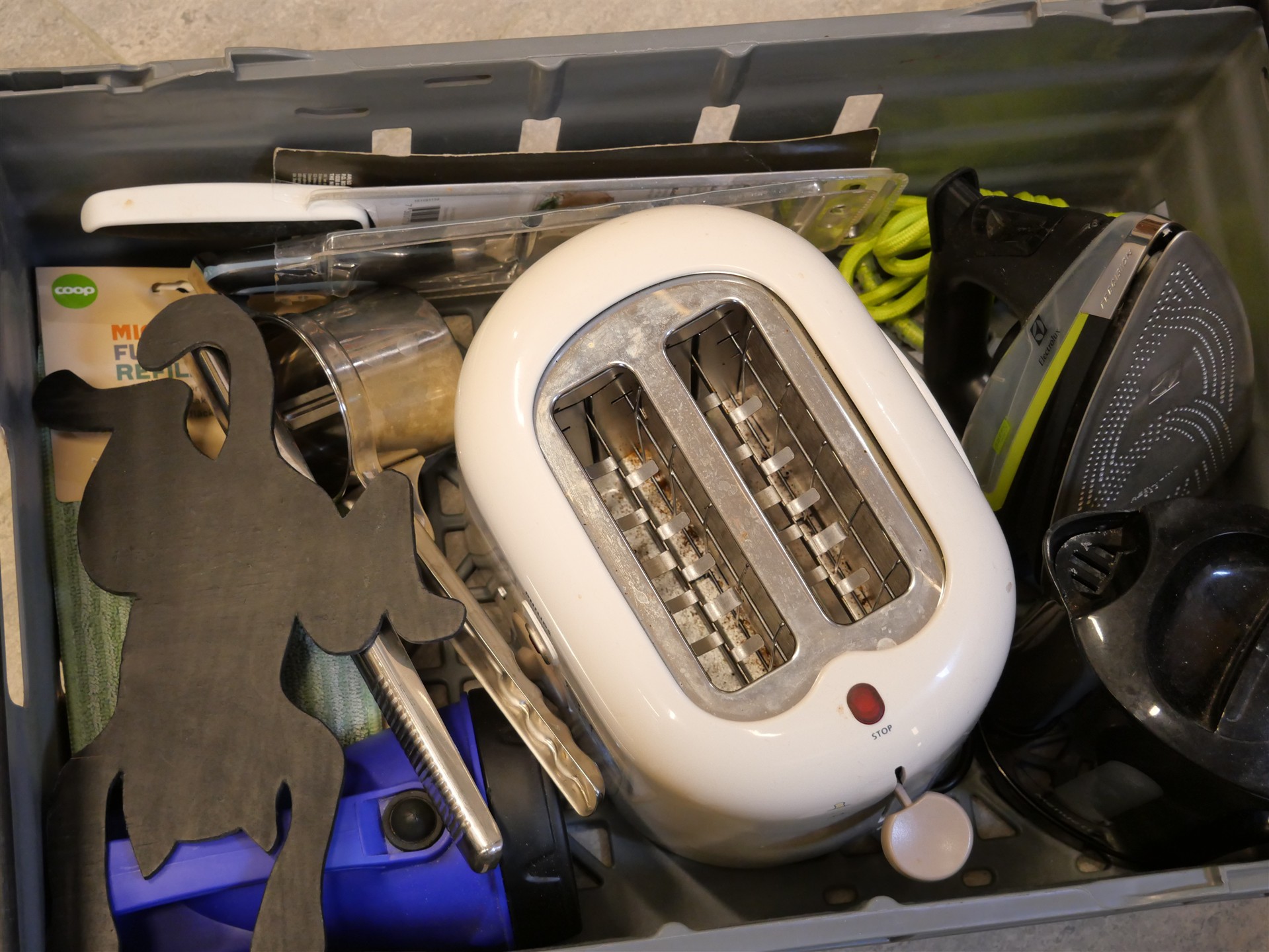 216. Husgeråd bl a brödrost, strykjärn mm. (Lådan ingår ej)