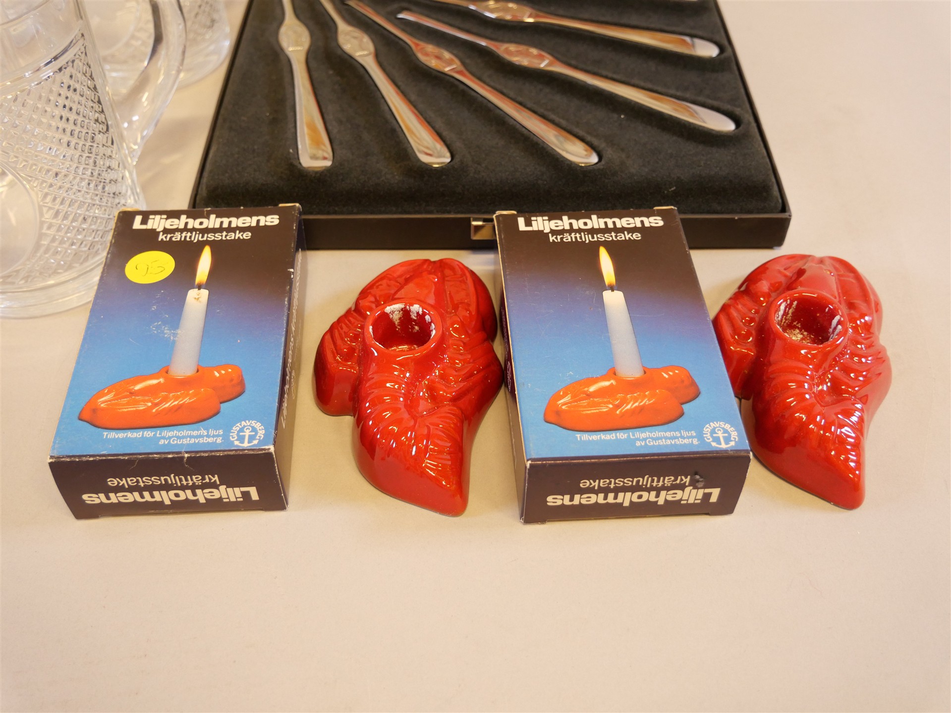 274. KRÄFTLJUSSTAKAR Liljeholmens, Ölsejdlar 4 st med kräftmotiv och skaldjursgafflar.