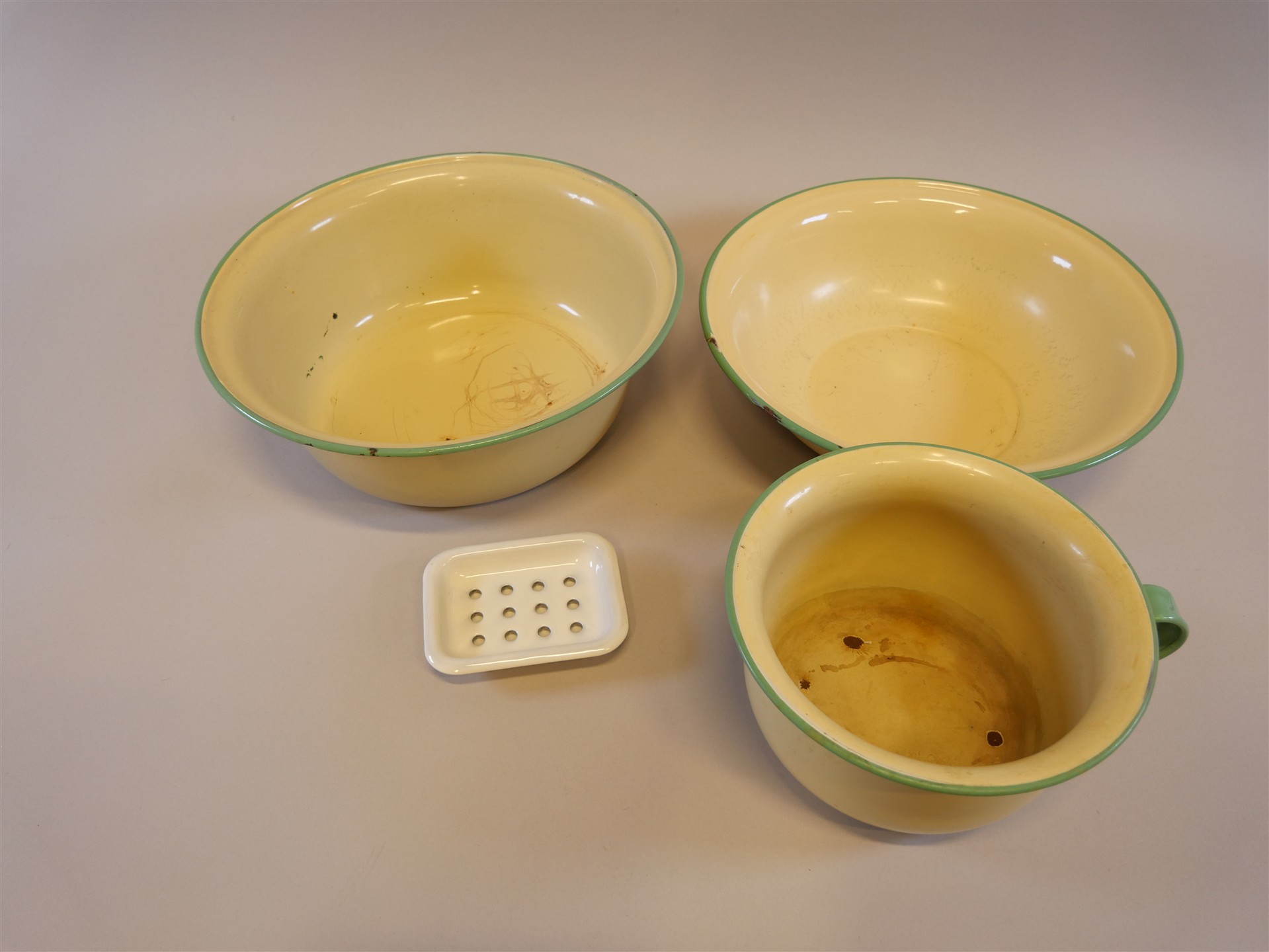 058. KOCKUMS. Nattkärl, tvättfat 2 st och tvålkopp. Bruksslitage.