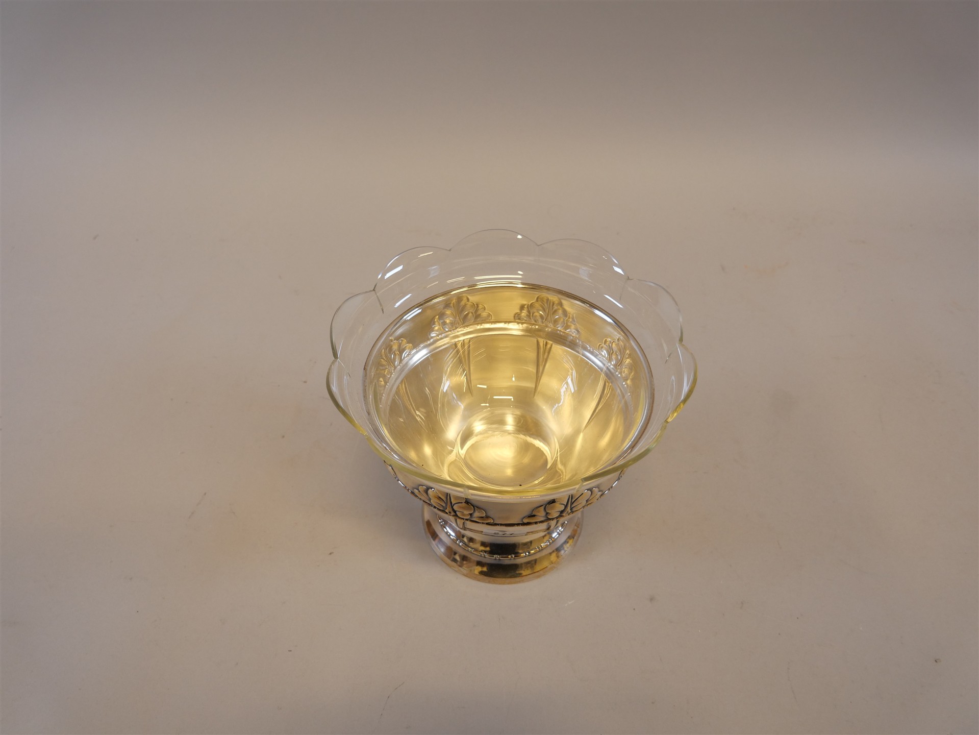 277. Nysilverskål med glasinsats. H. 18 cm. Diam. 21 cm.