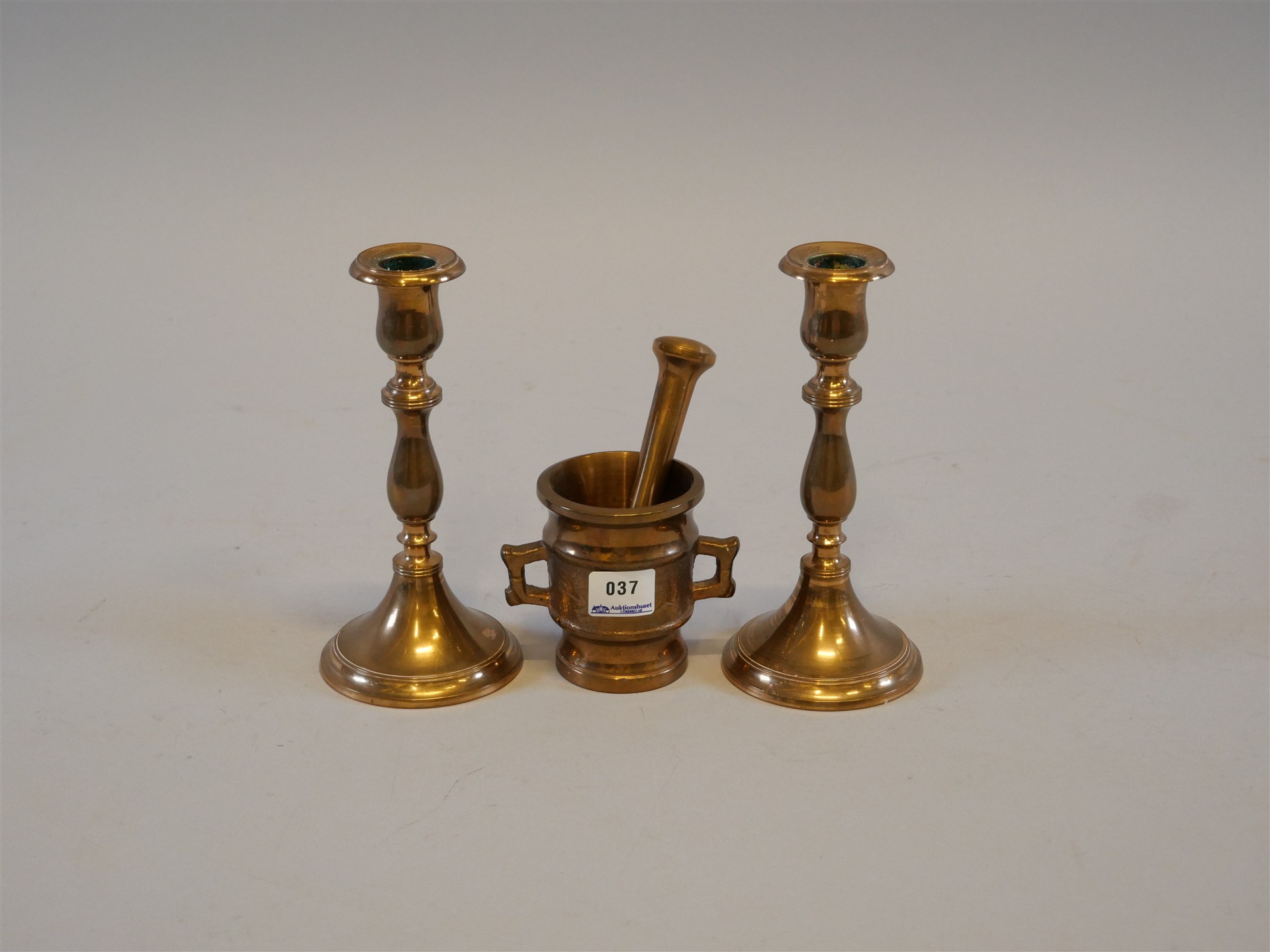 037. LJUSSTAKAR 1 par H 17,5 cm & Mortel H 8 cm mässing.