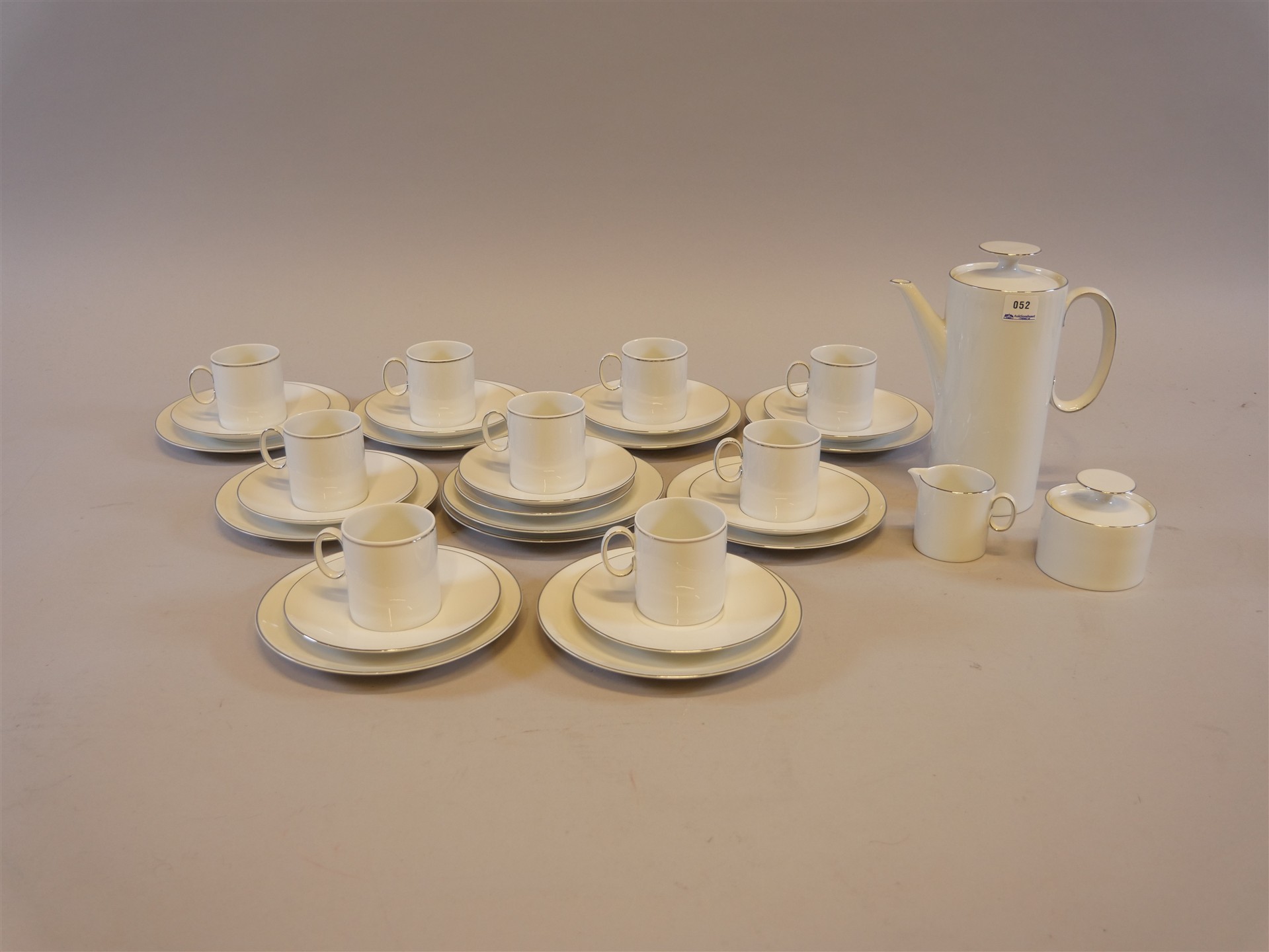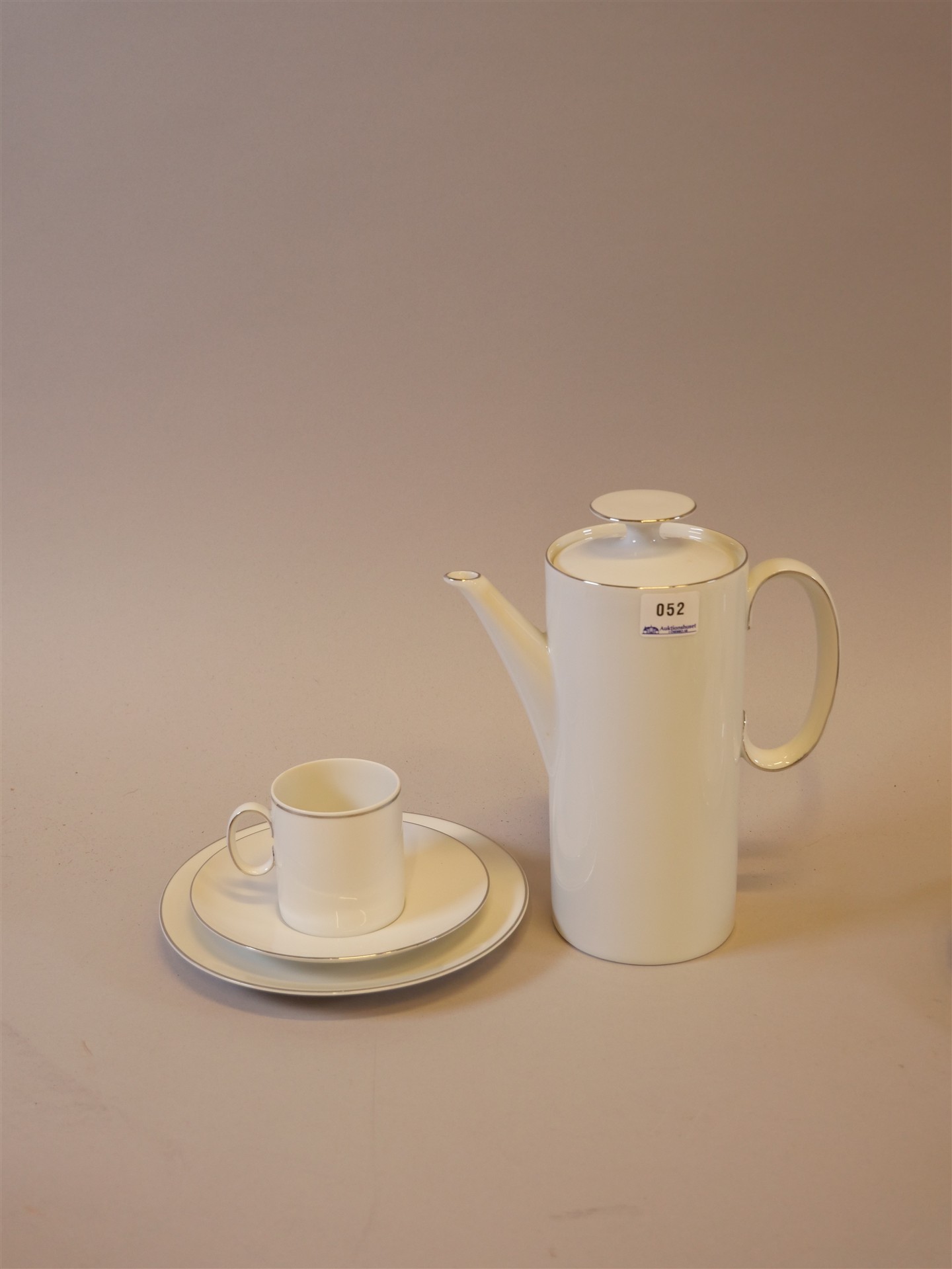 052. KAFFESERVIS. Kaffekoppar 9 st. Assietter 10 st. Kaffekanna,. Sockerskål & Gräddkanna.