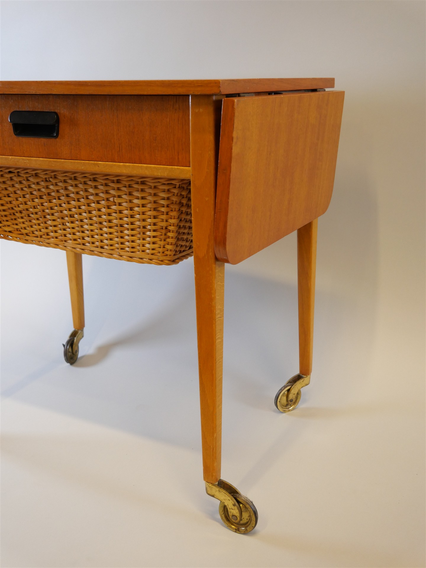 151. SYBORD, teak. Skiva med uppfällbara klaffar, förvaringskorg i rotting. H. 60 cm. L. 58 + 20 x 2 cm. Djup 42 cm.