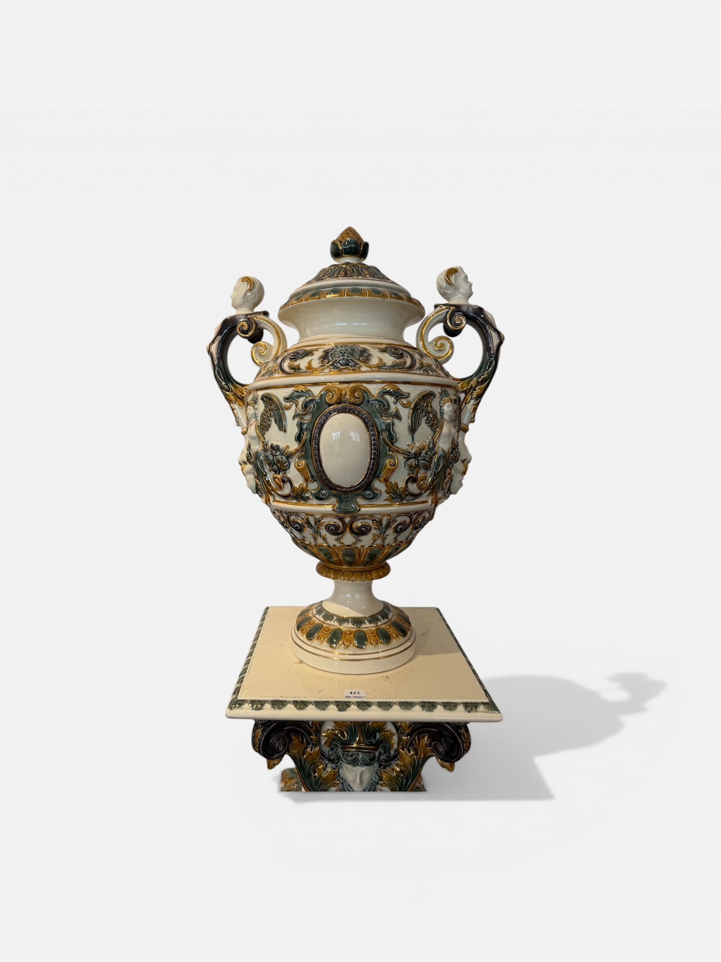 421. PIEDESTAL samt PRAKTURNA, majolika, Rörstrand, sent 1800-tal. Rik reliefdekor med polykrom glasyr och guld. Djupstämplad Rörstrand. H 120 cm + 60 cm.