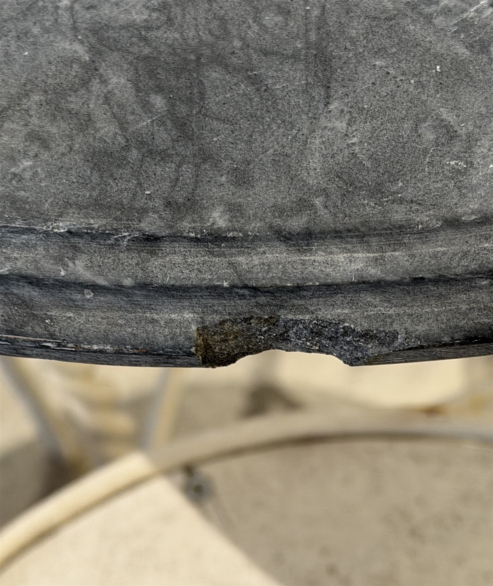 454. CAFÉSET. Bord gjutjärn med marmorskiva (kantnagg) & 3 st gjutjärnsstolar. Bordets mått H 71 cm. Diam 60,5 cm.