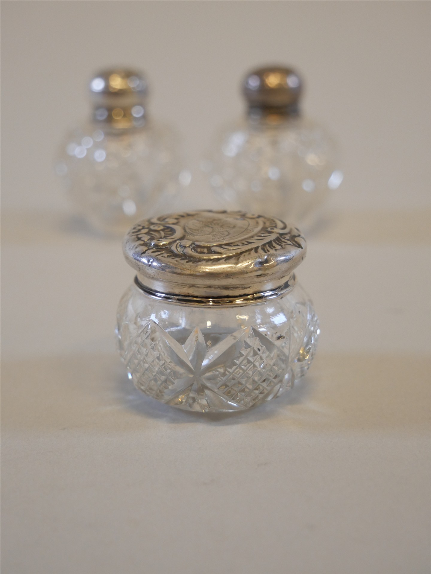 490. SALT/PEPPARSTRÖARE, silver/glas H 5 cm. BURK, silver/glas H 3 cm. England.