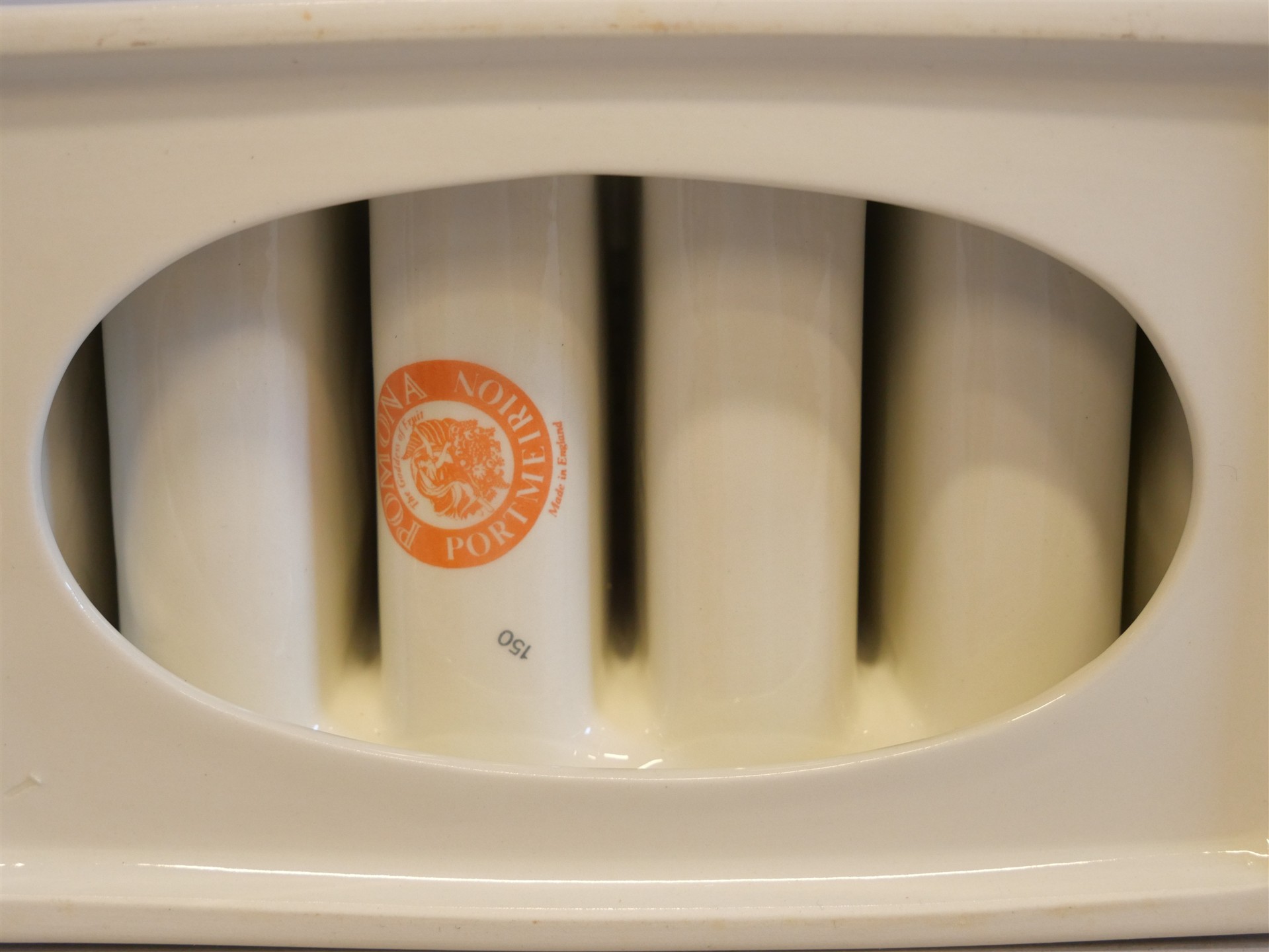057. POMONA, England. Kryddset bestående av: Vinägerflaskor 2 st, sockerströare, salt, pepparströare och brödställ.