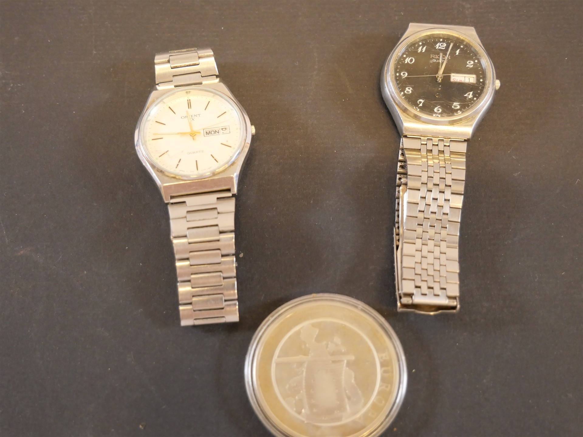 234. ARMBANDSUR 2 st Orient & Ricoh och EU mynt.