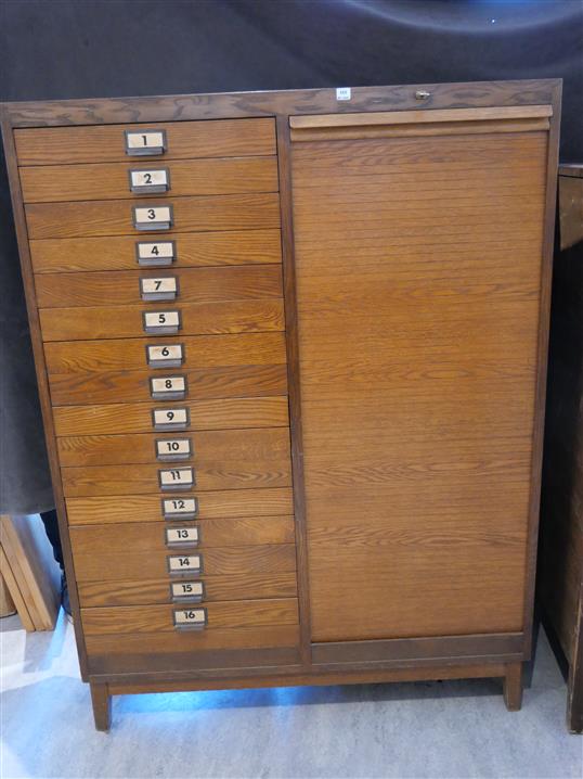 488. ARKIVSKÅP. Furu och Ek. Etikettmärkt Tranås kontorsmöbler. H. 145.5 cm L. 107 cm B. 42.5 cm. Fanerskador