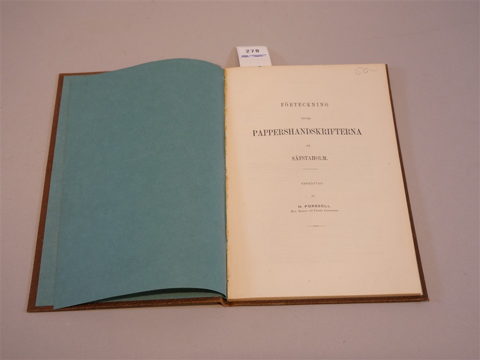 278. BOK. Pappers handskrifterna på Säfstaholm upprättad af H. Forsell 1869.