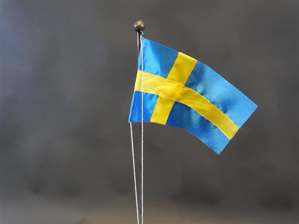 110. BORDSFLAGGA, vitmetall. Gottfrid Carlsson, Eskilstuna, Svea. Med gravyr. H. 63 cm.