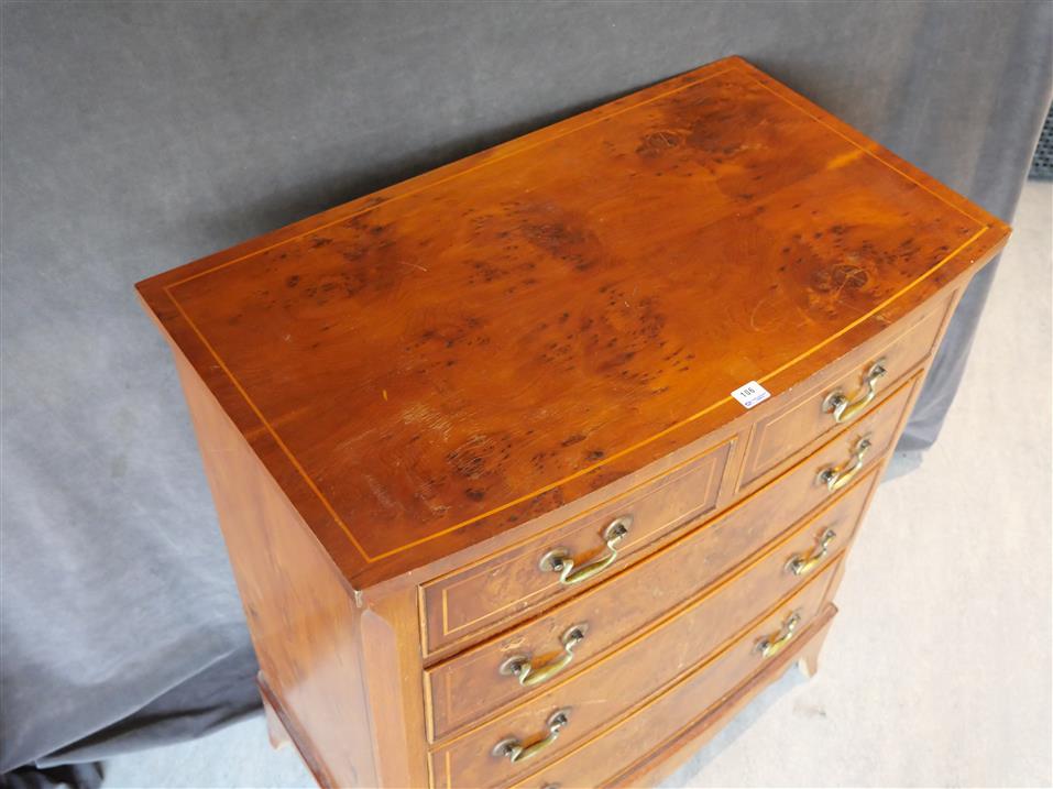 106. BYRÅ. 5-lådig. Engelskt. Stil, Idegran. H. 82.5 cm B. 71 cm Dj. 41 cm. Fanerskador förekommer