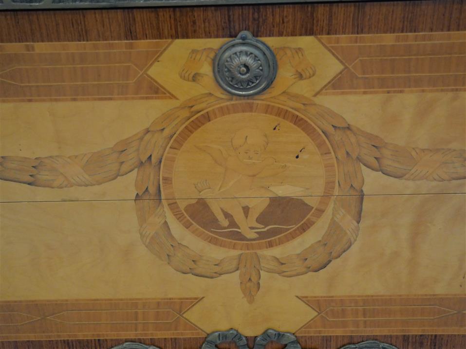 565. BYRÅ MED MARMORSKIVA. 3-lådig med Intarsia, Gust.Stil. Beslag med skador samt fanerskador. H. 82 cm. B. 95.5 cm Dj. 53 cm