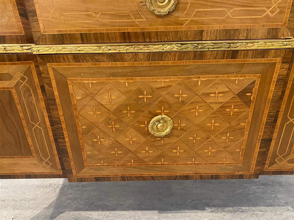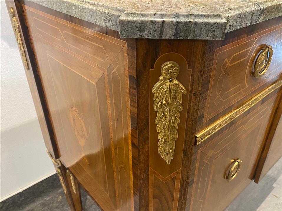 401. BYRÅ med marmorskiva. Gust.stil, intarsia och mässingsdetaljer. H 81 cm. B 116 cm. Dj 56 cm.