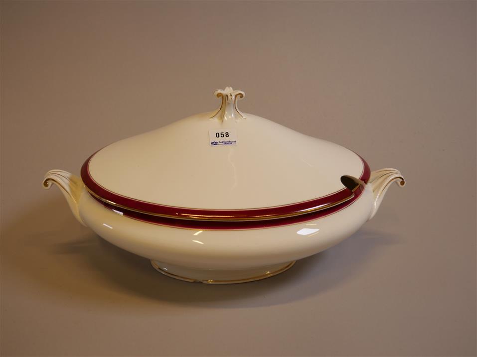 058. EMPIRE, Gustafsberg. Matservis. Bestående av: 9 st matttallrikar, 10 st djupa tallrikar, 12 st förrättstallrikar, 14 st assietter, terrrin med lock, bottennagg. 2 st såssnipor, tillbringare, 14 st uppläggningsfat (olika storlekar).
