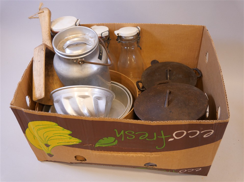 246. GJUTJÄRNSGRYTA h 1 1/2 liter och 1K, mjölkflaska mm.