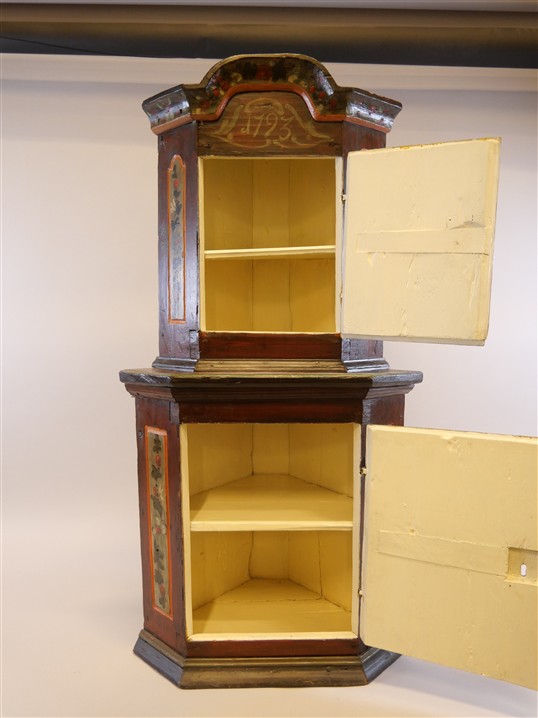 031. HÖRNSKÅP ALLMOGE, daterat 1793, senare kurbistmålning. H 129 cm. B 77 cm. Dj 42 cm.