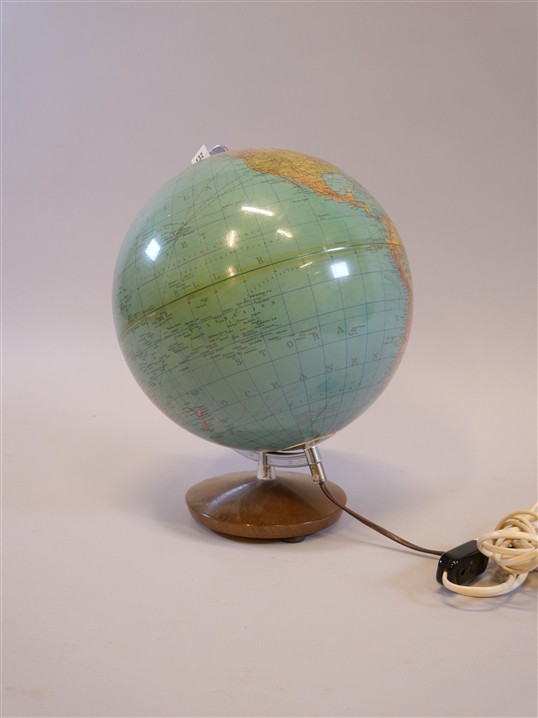 132. JORDGLOB med träfot, plast och belysning. H 37 cm.