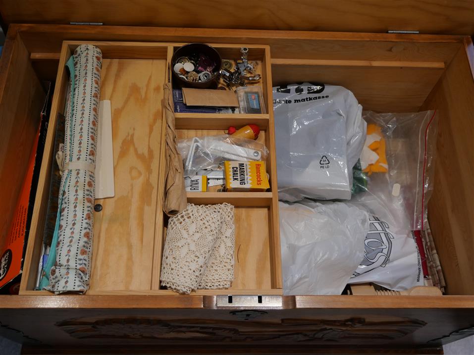 499. KISTA trä nyckel saknas med sytillbehör mm. H 47,5 cm. B 78 cm. Dj 50 cm.