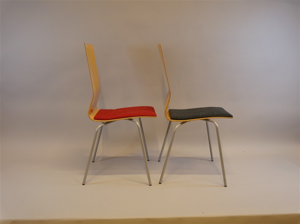177. KLAESSONS MÖBLER. Formpressade stolar med metallunderede. Med fast Röda och Grå/svart filtdyna. 6 st