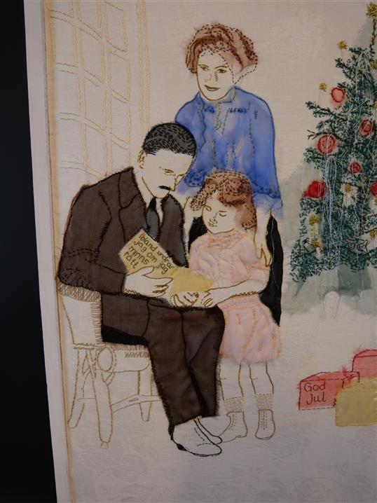 230. LARSPERS CARINA ROXÄNG. Tavla textil. "Ibland undrar jag om jag minns rätt". Tavlans mått 100 x 63 cm.