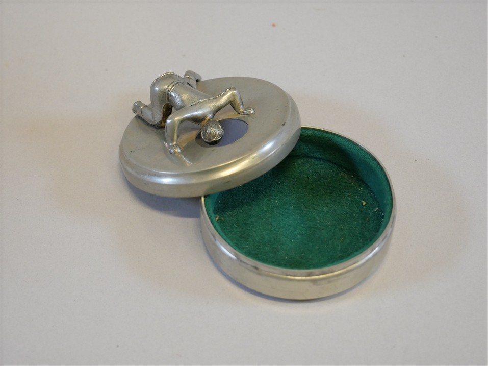 554. MANSCHETTKNAPPASK, tenn Widerholm & Dahlberg, Eskilstuna 1930/40-tal. Diam ca 6 cm.