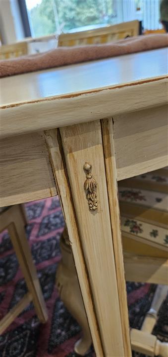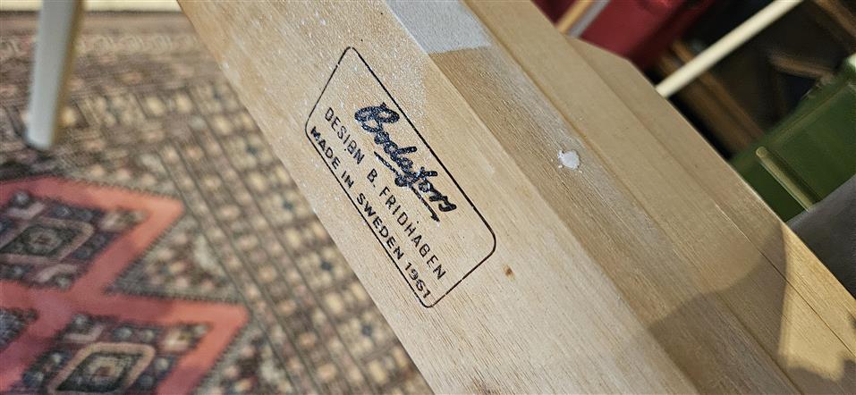 569. MATSALSGRUPP. Bodafors design B Fridhagen 1961. Senare bemålning. Gust.stil. Bord med 2 iläggsskivor och 4 st. Bruksslitage.