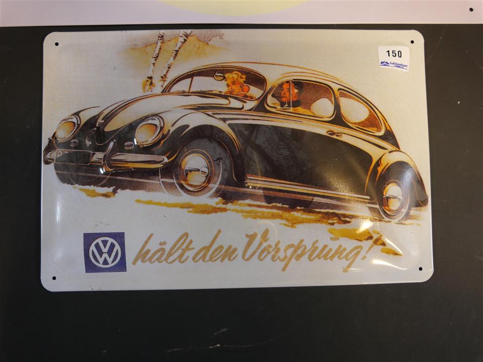 150. METALLSKYLTAR, 3 st. VW. Nytillverkade. B. 14,5 cm, 30 cm. resp. 40,5 cm.