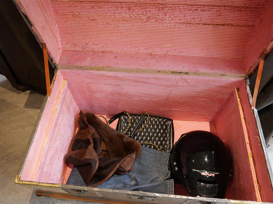 159. RESEKOFFERT. Innehåll hjälm, jacka och handväska. (Kofferten med skador)