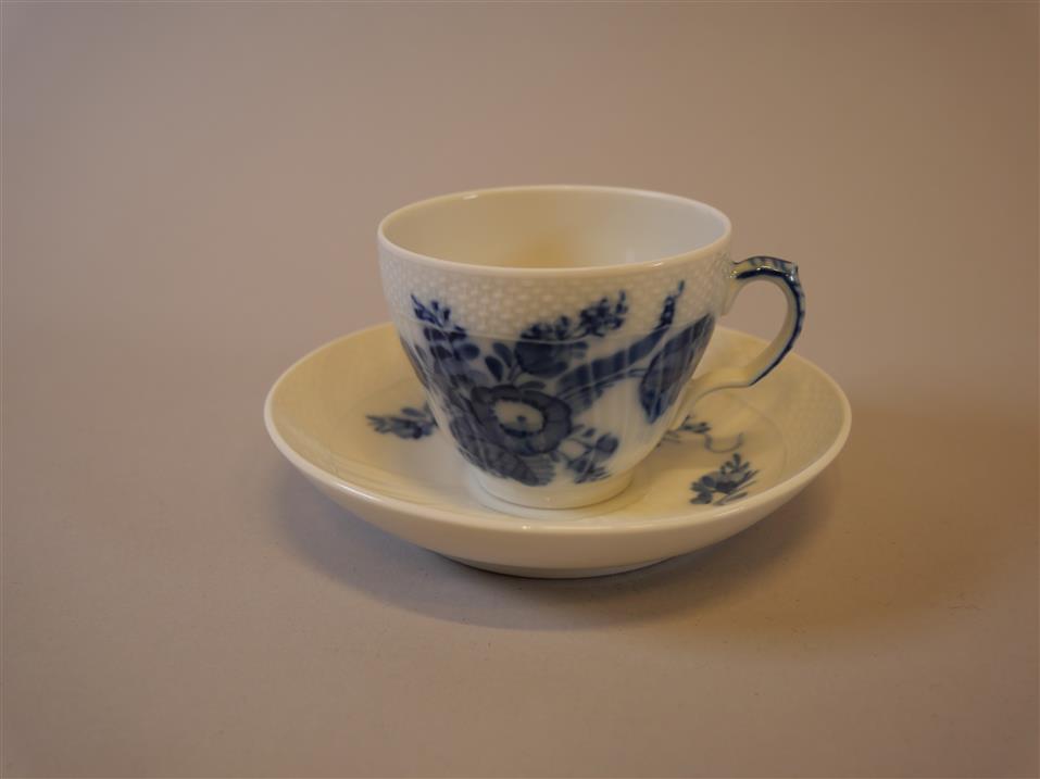 026. ROYAL COPENHAGEN. "Blå Blomster". Kaffekoppar 12 st, (10 st märkta 10/1549 samt 2 st 060.) Sockerskål 10/1678. Gräddkanna.