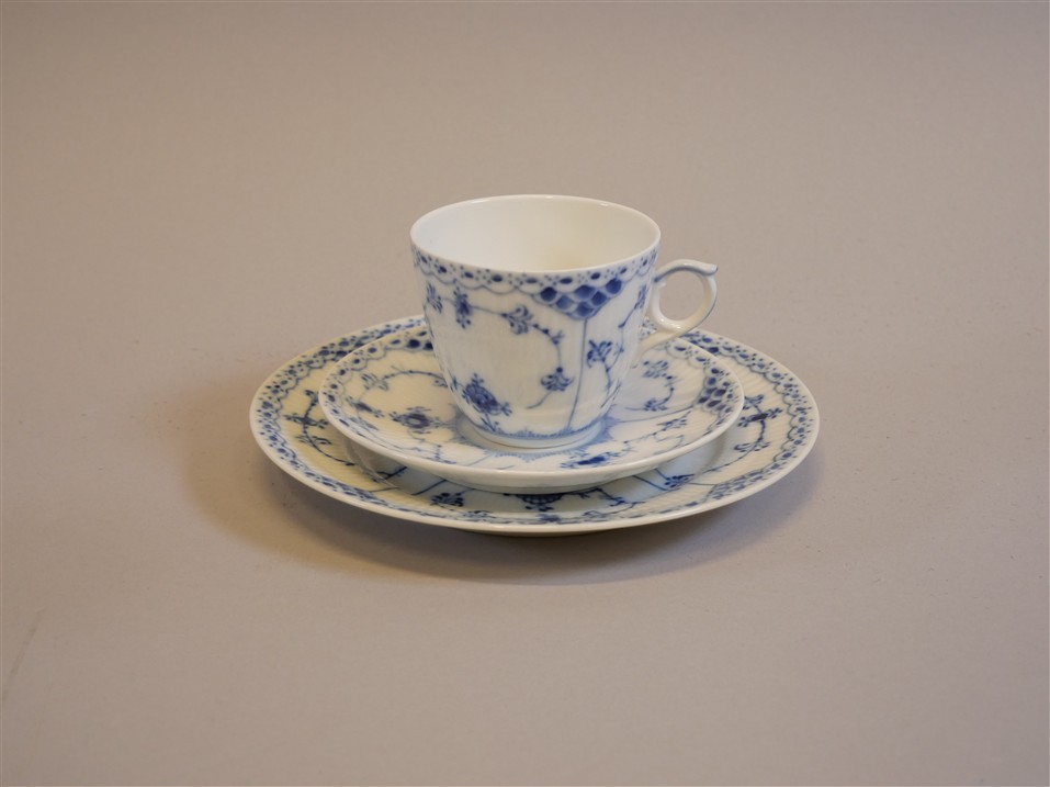 350. ROYAL COPENHAGEN. "Musselmalet", halvblond. Kaffekoppar 9 st (719), assietter 9 st (574), sockerskål (1112), gräddkanna (1031), sockerskål m lock (398).