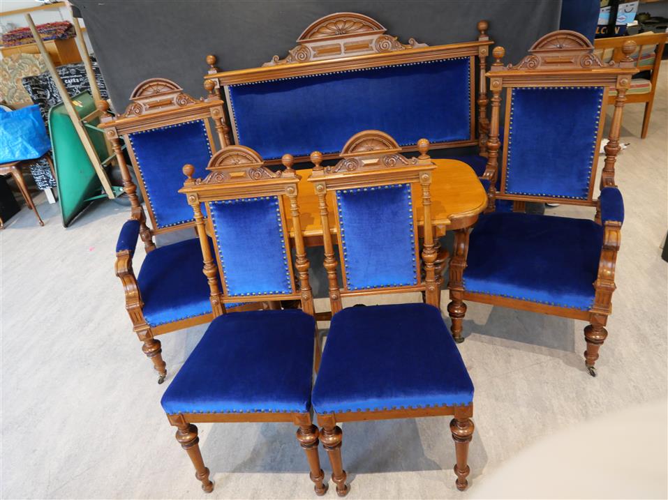 101. SALONGSGRUPP. Nyrenässans, Soffa L 156 cm H. 121.5 cm Sitthj. 41 cm, Karmstolar 1 par, stolar 1 par och bord.
