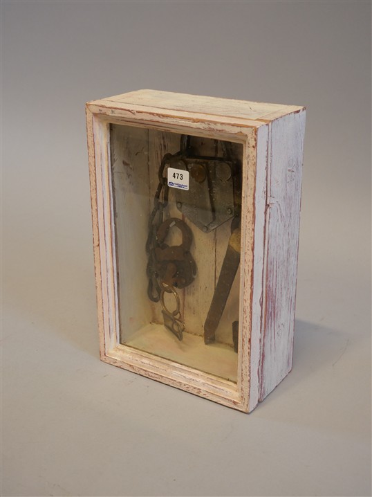 473. SKÅP med hänglås och nycklar. Skåpets mått H 10,5 cm. L 30 cm. B 20,5 cm.