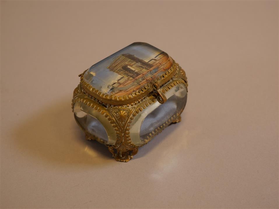 430. SMYCKESGÖMMA. Glas och metall. H 4,5 cm. L ca 8 cm. Dj 5 cm.