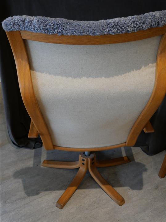 204. SNURRFÅTÖLJ MED PALL. Trä och fårskinn med nackkudde.