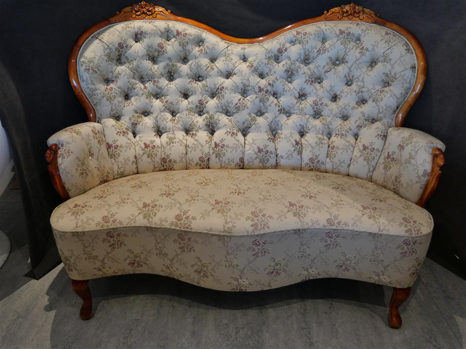 484. SOFFGRUPP, Nyrokokostil. Soffa samt Pelarbord och Fåtöljer 2 st. Soffans L. 136 cm. Bord med fanerskada