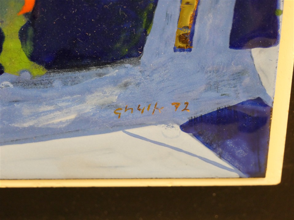 542. STIG GHYLFE. Emaljmålning. Signerad: Stig Ghylfe -72. "Spelet kan börja". Emalj på träplatta. Tavlans mått: 34 x 34 cm.