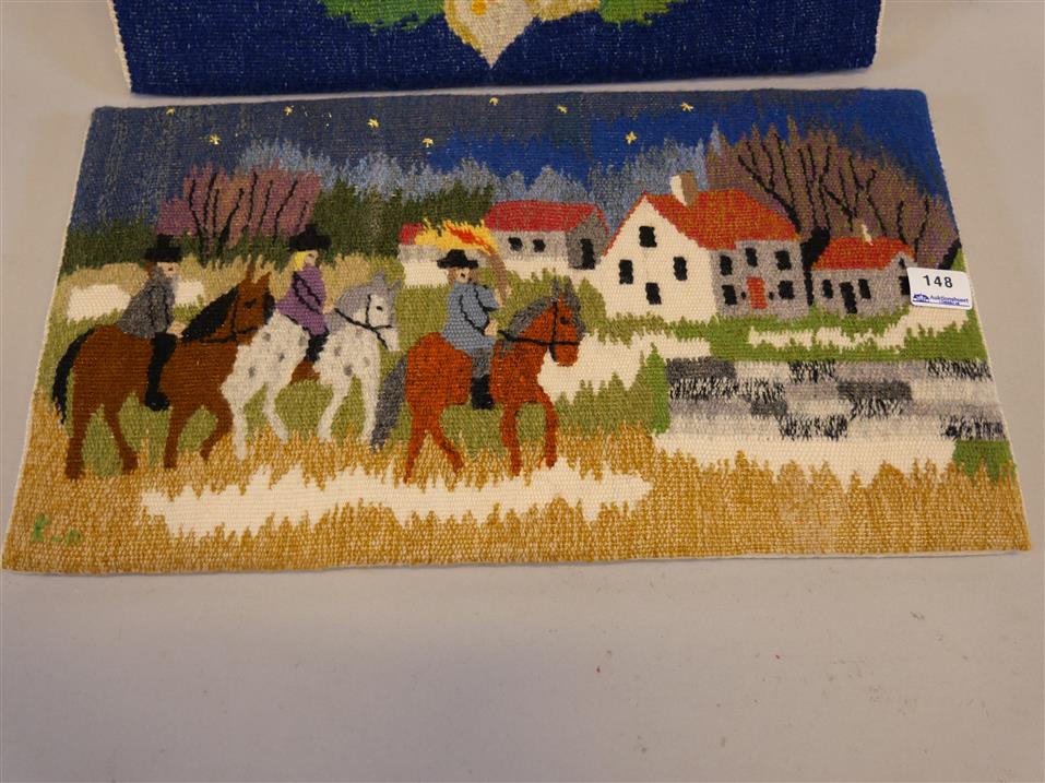 148. TAVLOR, vävda, bl a "Staffansritt". Mått: ca 23 x 40 cm. resp. 36 x 37 cm.
