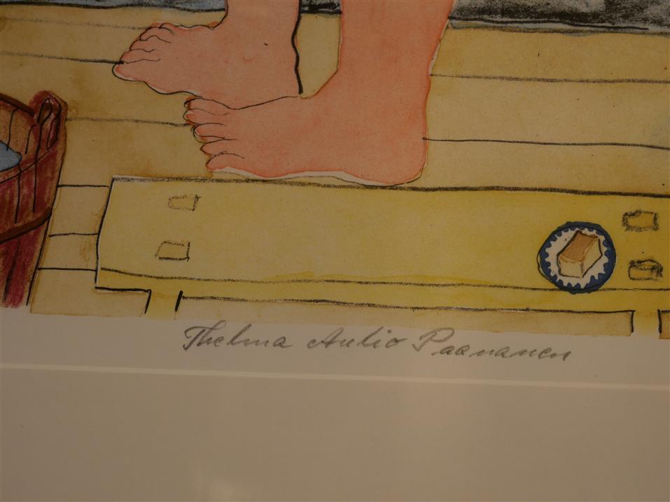 282. THELMA PAANANEN, Litografi, sign Thelma Paananen 143/360 "Familjebastu". Tavlans mått: 90x68.5 cm