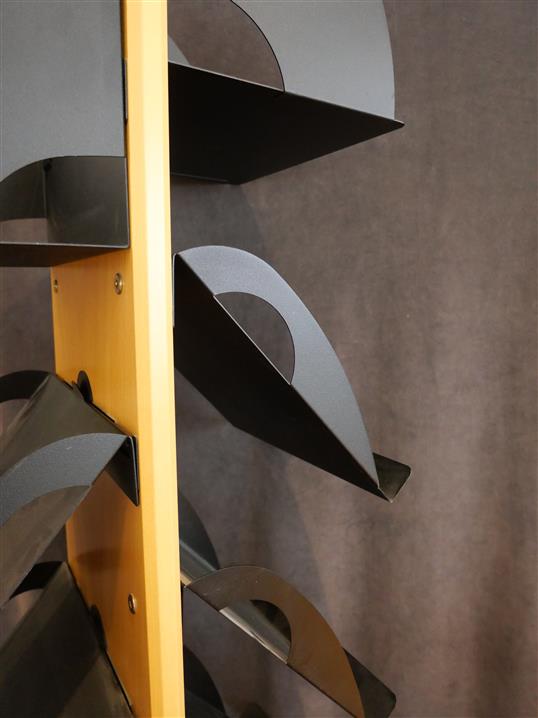 524. TIDSKRIFTSHÅLLARE trä med svartmålade metallplan. H 185 cm. B 33,5 cm.