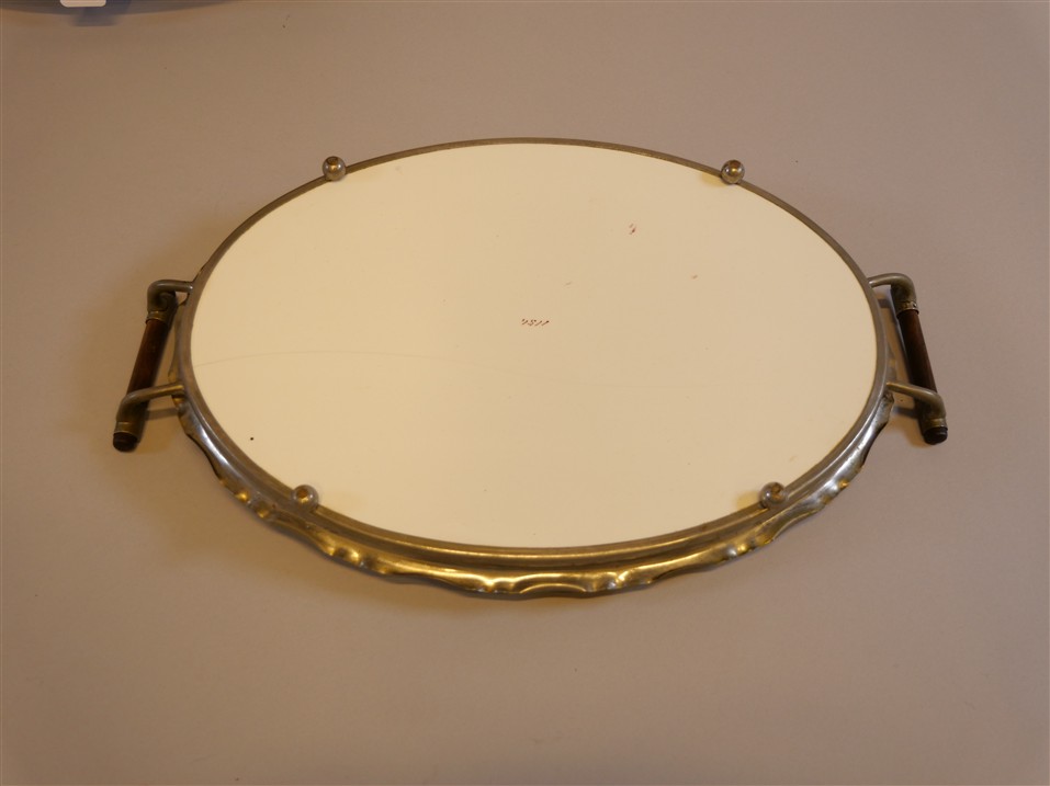 371. VÄGGBRICKHÅLLARE, jugend samt bricka porslin samt metallbeslag. Brickhållarens mått: H. 66 cm. B. 34 cm. Brickans mått: L. 42 cm.