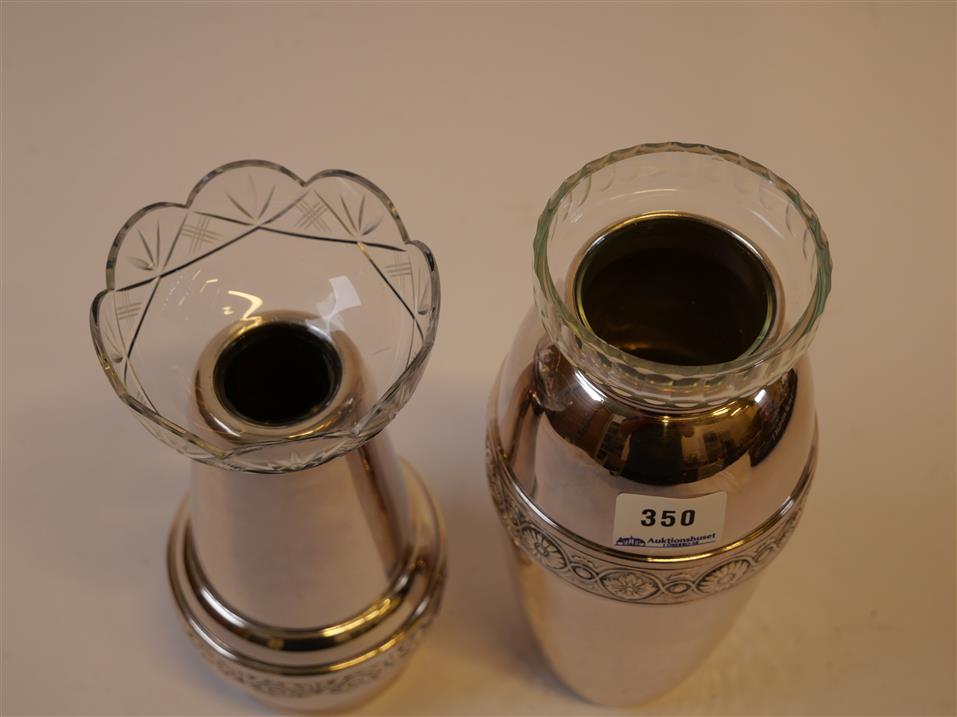 350. VASER, 1 par, nysilver med glasinsatser. H. 18 cm. resp. 19,5 cm.